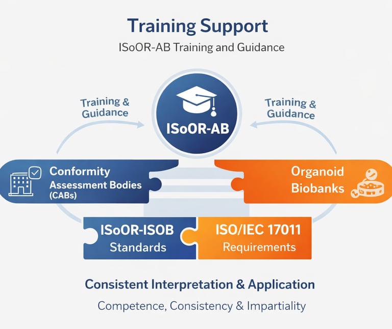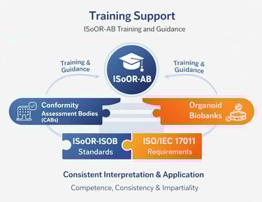 ISoOR-AB provides structured training and guidance to Conformity Assessment Bodies (CABs) and organoid biobanks to ensure a consistent and accurate interpretation and application of the ISoOR-ISOB standard. Training programs cover all aspects of the standard, including quality management, sample handling, data integrity, and ethical compliance, while emphasizing competence, impartiality, and scientific rigor.